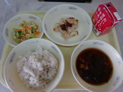 今日の献立は、「麦ごはん・牛乳・鶏肉のてり焼き・キャベツの煮つけ・赤だし」でした。給食室のツリーには飾り付けがされて、クリスマスモードが進んでいます。今日も美味しい給食、ごちそうさまでした!