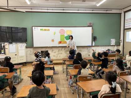 1年生は今年度2回目の栄養教諭の先生との学習を行いました。今回のテーマは「やさいをたべよう」です。授業では、グループごとに野菜のどの部分を食べているのかを考えました。根の部分を食べる野菜もあれば、葉の部分を食べる野菜もあり、種類によってさまざまです。子どもたちは、普段食べている野菜について新しい発見をしながら楽しく学ぶことができました。