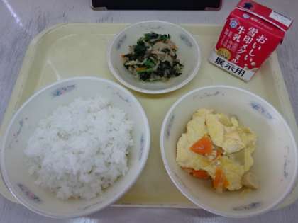 今日の献立は、「ごはん・牛乳・高野どうふの卵とじ・ほうれん草と切干大根のごま煮」でした。高野どうふの卵とじは、けずりぶしからとっただしを使っています。だしをたっぷりとふくんだ食材のうま味を感じながらいただきました。今日も美味しい給食、ごちそうさまでした!