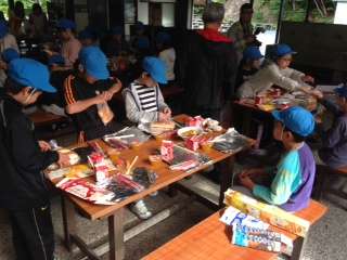 朝食はバックドックを作りました。パンに野菜とソーセージをはさみアルミホイルに包んでパックに入れて直接火をつけます。ちょっと焦げ目もつきましたがみんなパクパク食べました。みんなで食べるとおいしいね。