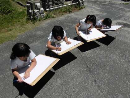 計量の図画コンクールに向けて,「気温を測る友だち」を描いています。今日は画板をもって畑の周りを描き進めました。“詳しく大きく”描いています。