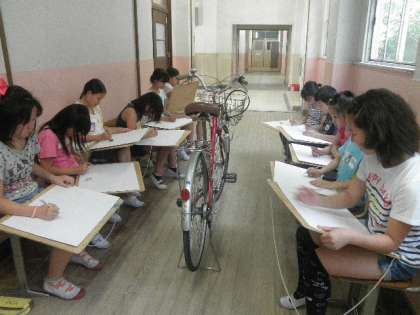 図工の時間に,自転車を描いています。細部までよく見て集中して描いています。「今日は,自転車を描くよ!」と伝えると,すかさず「え〜!そんなん描けませ〜ん!」と声をそろえての返事でした。でも,描きはじめるとみんな真剣に,誰も話をせず頑張っていました。