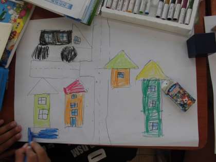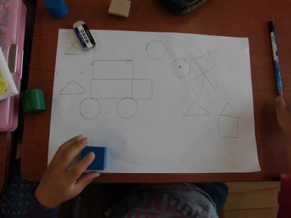 昨日は,はこのかたち・まるいかたち・つつのかたちの学習をしました。今日は,いろいろな立体の面を写し取り,形の特徴を生かして絵をかきました。みんなの前で発表もしました。