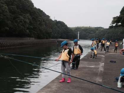 初めてつりをする子どももたくさんいましたが,慣れない手つきで餌の小エビをつけて釣りました。