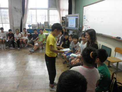 4月から教えていただいていたALTの先生が本国に帰られることになり,今日(7月6日)が最後の授業となりました。子ども達は,一人一人お別れのメッセージを用意して授業に臨みました。前半は,ALTの先生から調子のよいチャンツを教えていただきました。後半は,クラスでしていたゲームをALTの先生と一緒に英語で楽しみました。