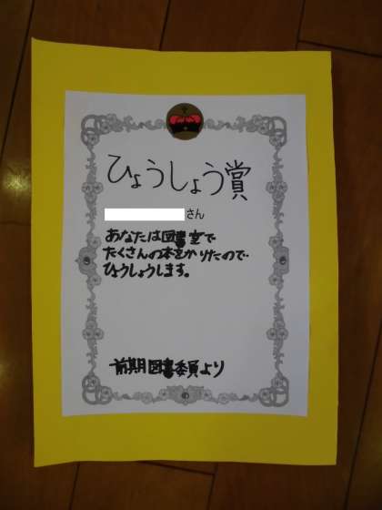 始業式に続いて,委員会の発表がありました。その中で図書委員会から,本をたくさん読んだということで,表彰状が渡されました。1年生では,1名の子が表彰されました。