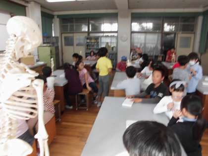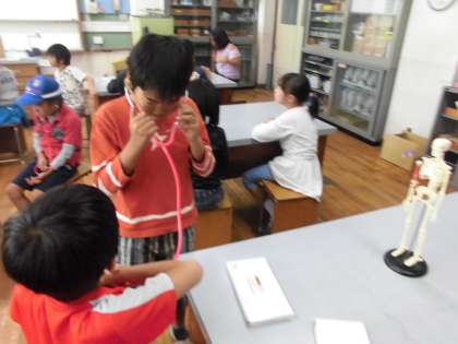 理科の学習で,骨や筋肉の様子,その働きを学習しています。今日は理科室に行き,骨格の標本を観察したり聴診器を使って自分の鼓動を確認したりしました。