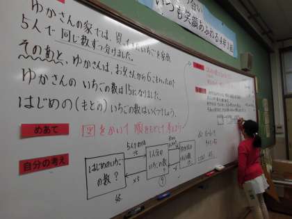 関係図を使って,もとの数を求めています。自分の考えを隣の友だちに説明し合い,考えを深めています。