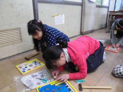図工の時間に転がれコロコロ(玉ころがしげーム)を作っています。くぎ打ちがとっても楽しそうな子どもたちです。こちらも2月の作品展に出品します。お楽しみにしていてください。