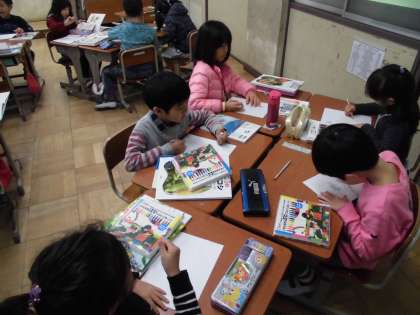 国語「ものの名まえ」の学習を生かして,お店屋さんごっこをします。今日は,その準備をしました。写真は,果物屋,車屋,ケーキ屋,八百屋,スポーツ用品店などに売っている物を調べて,売り物のカードを作りました。