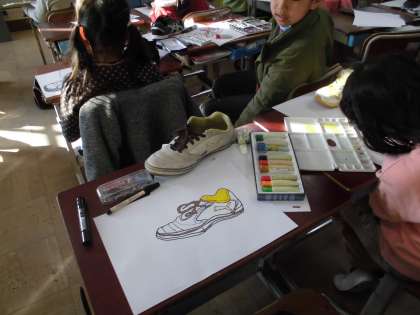 自分の靴を描いています。フェルトペンでのスケッチです。時間を短時間に区切って集中して描いていました。