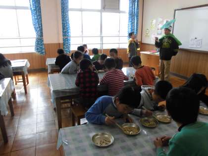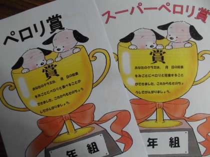 給食週間中.おかずを全部食べきるとペロリ賞,おかずもごはんも食べきるとスーパーペロリ賞がもらえます。いつも以上にしっかりと食べている子どもたちです。
