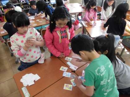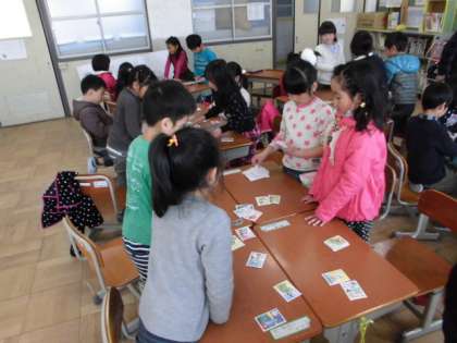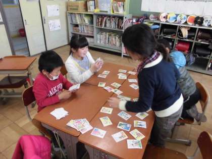 今日は,班でかるた遊びをしました。読み札も自分たちで読みました。ルールを守って楽しく遊べました。