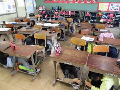 先週3月11日(金)のことですが,東日本大震災の5年目の日にシェイクアウト訓練を行いました。いざという時に備えて日頃より意識し,いざという時に自分の命を守る行動ができるよう指導しています。