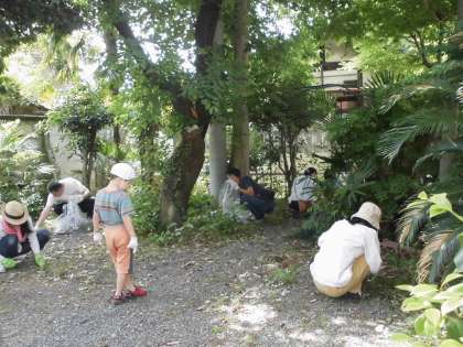 子どもたちや保護者・地域のみなさん,教職員が一緒になって,主に「朱六の森」周辺の草抜きをしました。