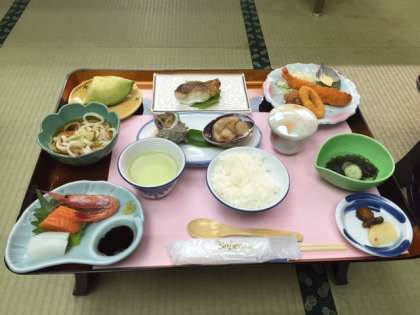 食事は豪華な海の幸。鯛のお刺身や大あさり、サザエもありました。もずくもメバルの塩焼きもとっても美味しかったです。