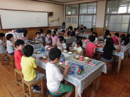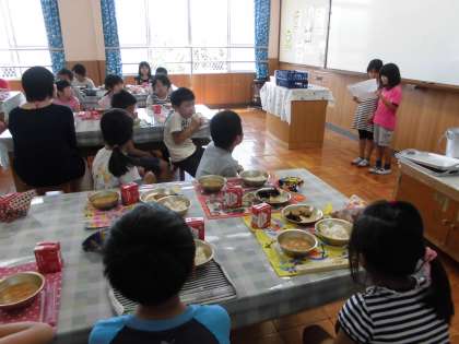 今日はランチルームで食べました。栄養教諭の前田先生と一緒に食べました。いつもとは違うグループで食べることにも喜んでいた子どもたちです。