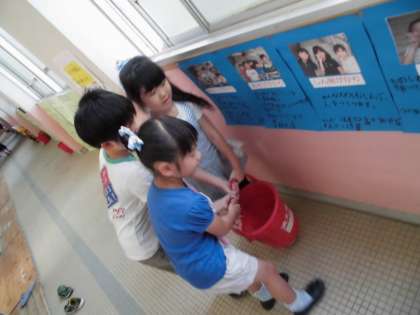 掃除の後に,防火用水の水替えをしています。みんなで協力し合って進めています。