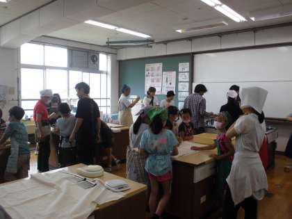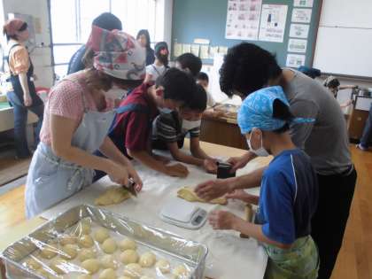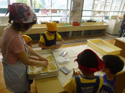 今年はドーナツ作りに挑戦。1年生も小さな手で,がんばって成形していました。ドーナツが揚がり始めると甘いいい香りがしてきました。出来上がったドーナツを,みんなおいしそうに頬張っていました。
