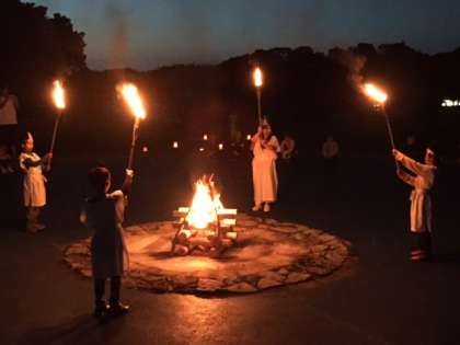 火の女神と女神の子どもたちから火をもらい,大きな火を囲んでのファイヤーです。