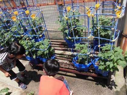 畑の野菜が実りました。とっても大きなピーマンができました。個人で育てているミニトマトも緑の実ができ始めています。