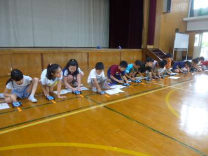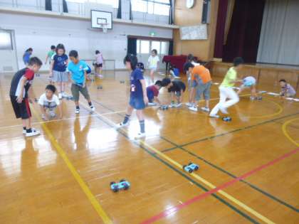 子どもたちは,とても楽しそうに活動していました。実験の結果から「引く長さを長くすればするほど,走るスピードは速くなり,遠くまで動く」ということを理解することができました。また,それは「ゴムは引けば引くほど,もとにもどろうとする力が強くなるからだ。」ということも理解していました。