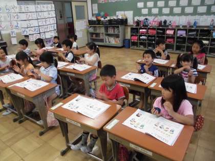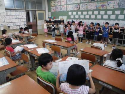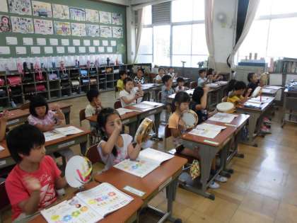 拍の流れにのって手拍子を打ったり,言葉でリレーをしたりしています。カスタネットやタンブリンのリズム打ちも上手になってきました。班ごとの言葉リレー発表会は,いろいろな言葉がつながり,笑いにつつまれていました。その後,リズムにのせて話すのが子どもたちに大流行しています。
