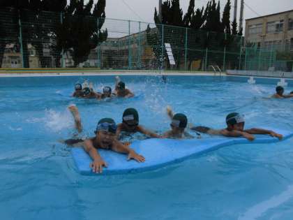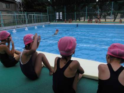 なんとか天気大丈夫でした!今日も楽しく学習を進めました。ロングビート板を使って,みんなでバタ足の練習を頑張りました。協力し合うととっても楽しかったようです。・