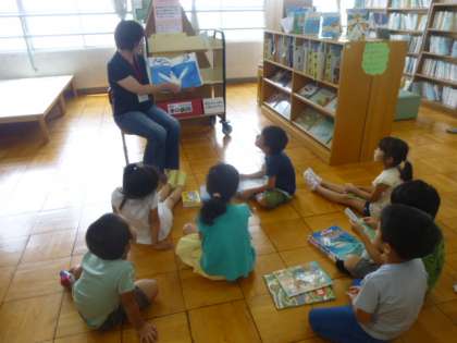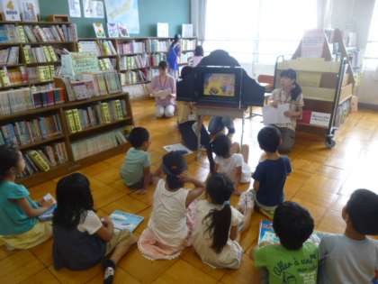 今回は,長谷川義史作の「へいわってすてきだね」という本と「うなぎにきいて」という紙芝居でした。「本はともだち」の皆さんがいろいろな登場人物になり切って読んでくださった紙芝居を,集まった子どもたちは楽しそうにきいていました。