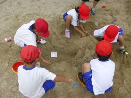穴を掘ったり,水をかけたり,トンネルをつくったり,カップで型抜きをしたり・・・。