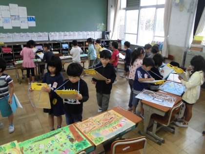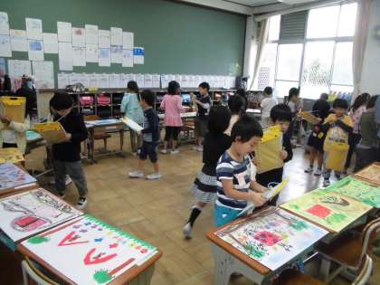 図工で取り組んだ「お話の絵」の鑑賞会を行いました。教室を美術館に見立て,ぐるりと並べたお互いの絵を見て回りました。クラシック音楽をBGMに,心穏やかに絵の世界に浸りました。