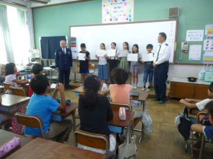 この度,5年生が「わたしのまちのおまわりさん」というテーマで作文を書きました。その中から本校の5年生が,「わたしのまちのおまわりさん」作文コンクールで,見事金賞・銀賞・銅賞を受賞しました。表彰のため,中京警察署長さんが来て下さいました。