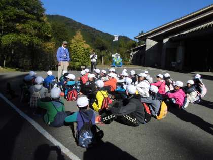 子どもたちが歩いている向こうに見える山の尾根も通ります。