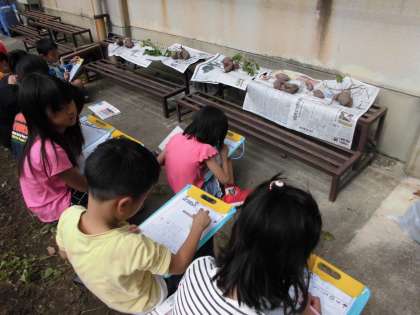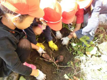 子どもたちが待ちに待ったおいも掘り。スコップや手を使って,おいもに傷がつかないよう丁寧に掘りました。どの班もつるに数個できており,思った以上の出来でした。畑から出てくる幼虫に興奮し,いもそっちのけの子になってしまう子も・・・。