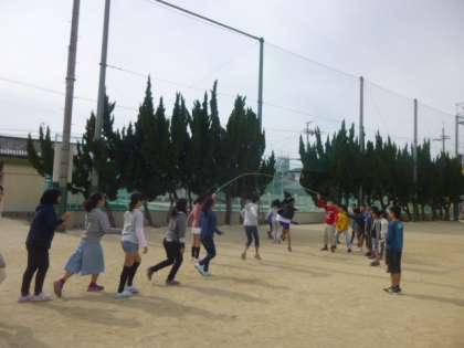 さすが6年生,大きく回した大波の中をスイスイと飛んで行きます。「もっと大きな声を出そうや。」という声も聞こえてきました。みんなで心を合わせがんばって練習しています。