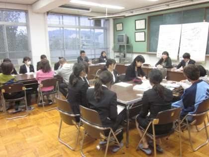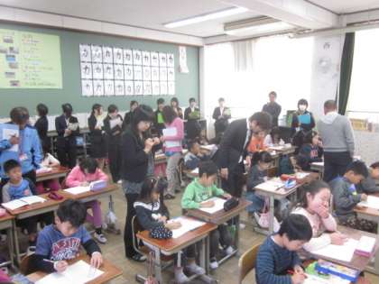 3年生の教室の様子です。分数の足し算に取り組んでいました。「1/5+2/5=1/5がいくつ分だから…」と一生懸命に自分の考えを図で表し,考える力を伸ばしていました。
