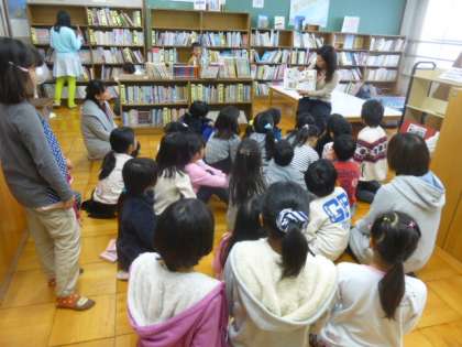1年生を中心に中学年,高学年の子ども達が,読み聞かせを楽しみに図書室に集まって来ました。絵本の世界に引き込まれるように,子ども達は絵本に見入っていました。