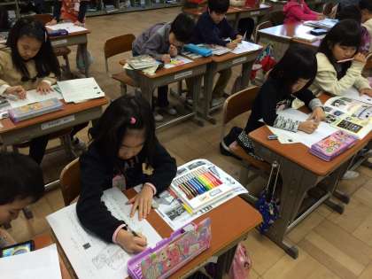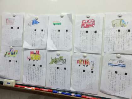 いろいろな車の「しごと」と「つくり」が書かれた説明文を勉強中です。学習のまとめは,一人ずつ好きな車を選び文に表すことです。図鑑や本を参考にしながら,それぞれの車の「しごと」と「つくり」を考えて書き進めています。