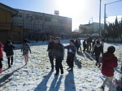 昨日からの積雪で,朝一番の運動場は真っ白(少し水たまりはありましたが…)。京都市内では,年に数回しかないチャンスなので,1時間目に運動場に出て雪遊びをすることにしました。雪合戦をしたり雪玉を作ったりして,楽しむことができたようです。