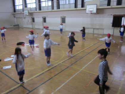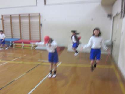 グループの友だちと協力し合って練習を進めています。跳んだ回数を数えてあげたり,跳び方をアドバイスしてあげたり…がんばって学習を進めている2年生です!