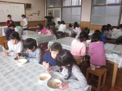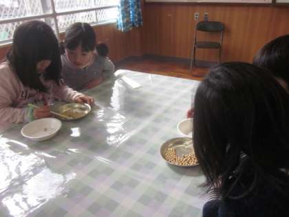給食委員会主催の豆つまみ大会がありました。「1分間で何個つまむことができるか」手に汗握って一生懸命にがんばった子どもたちです。優勝した子は46個でした!