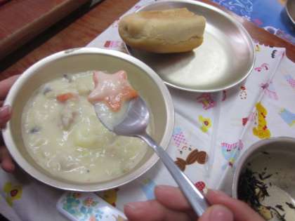 キノコのクリームシチューの中には,ラッキーキャロットが入っていました!なんと2個も入っていた子が…