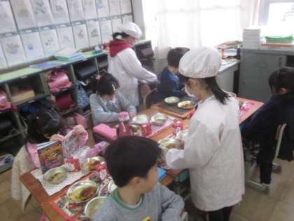 今日は卒業献立のとんかつでした。とってもおいしかったです!給食当番もとってもよくがんばっていました!