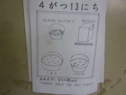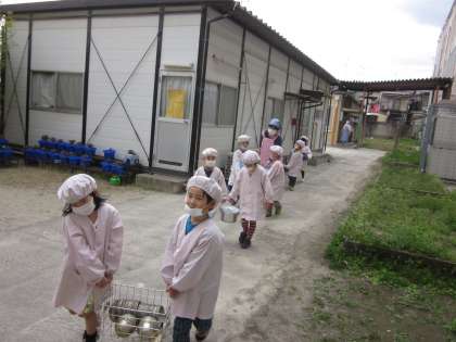 みんなが楽しみに楽しみにしていた給食が,いよいよ今日から始まりました。給食当番(みかんグループ)のみんなもとってもよく頑張りました。とってもおいしかったでーす!