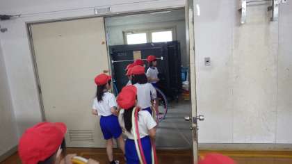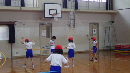 班ごとにフラフープを使って様々な運動を考えて行いました。