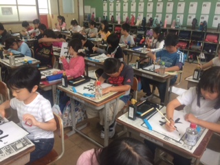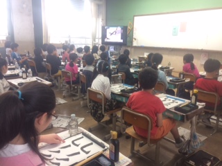 書写の時間は,教務主任の松井先生が教えてくださいます。今日は,その2時間目でした。運筆練習の後,「はらい」や「はね」に気をつけて,「花」を書きました。映像で見るお手本の字の美しさに「おー!」と歓声をあげる子どもたち。一人ひとり集中して,丁寧に書くことができました。また,教室に掲示しますので,ぜひご覧ください。