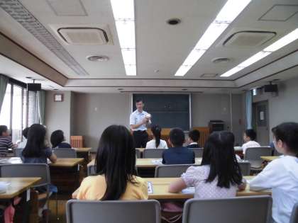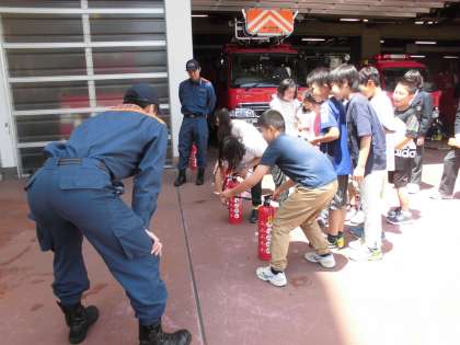 中京消防署へ社会見学に行ってきました。まず,署員の方に消防署の仕組みや仕事について教えていただきました。その後,実際に消防車や消防用具を見せてもらったり,消火器の使い方を教わったりしました。最後には,質問にも答えてもらい,たくさんのことを学んで帰ってきました。