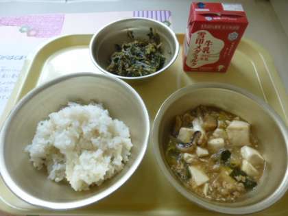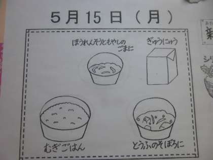 5月15日(月)の給食は,とうふのそぼろ煮・ほうれん草ともやしのごま煮・麦ごはん・牛乳でした。