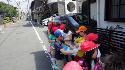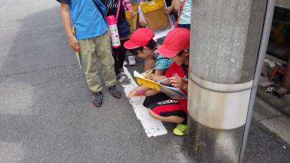 社会科の学習で校区地図を作るために,グループごとに校区を回り白地図にお店等を記入していきました。