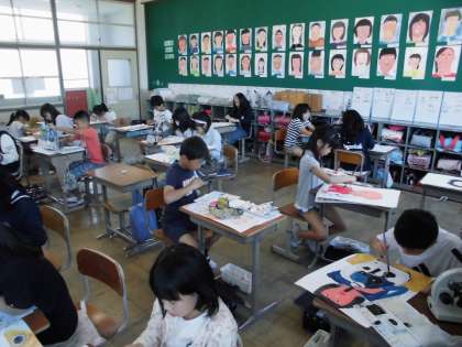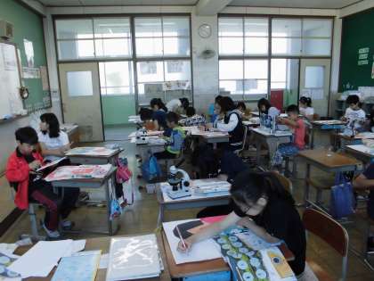 今,5年生は図工の時間に『顕微鏡で小さな生き物を観察しているお友だち』の絵を描いています。まず,顕微鏡から描き始め,次に顕微鏡をのぞいているお友達を描いています。細かいところまでしっかり見て真剣に描いています。参観日には,子ども達の力作を見ていただけることと思います。